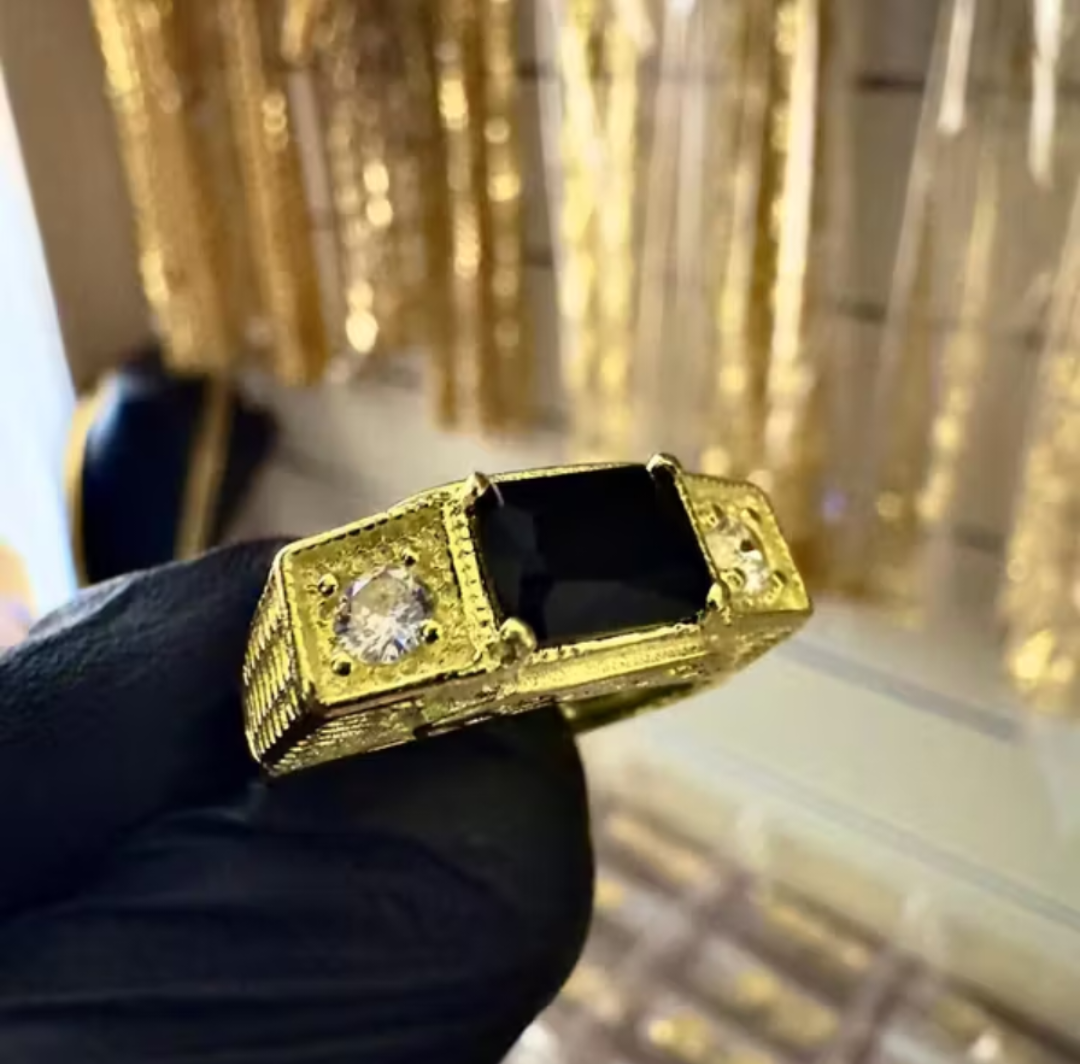 O anel de formatura com pedra preta possui design elegante, tamanho ajustável e acabamento sofisticado, sendo uma ótima lembrança para marcar a conclusão do curso.