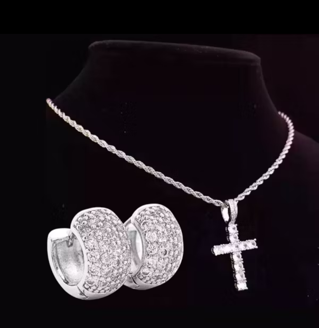 ✨ Conjunto Premium – Brincos Cravejados + Colar Cruz de Zircônias ✨